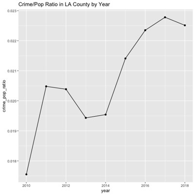 Based off of publicly available data from the LAPD we were able to measure that reported crime in South LA steadily increased from 2010 to 2018 and reached a peak in 2017.