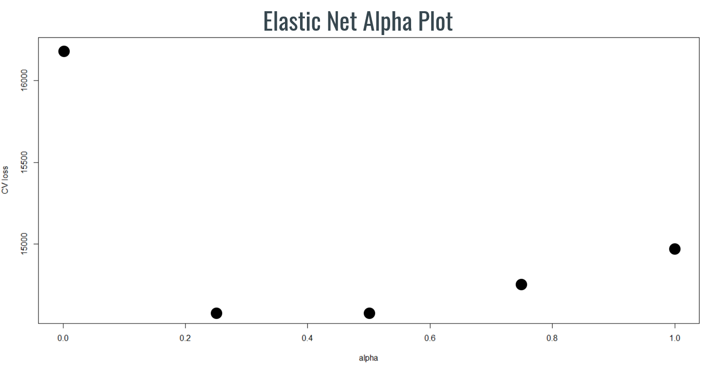 Although OLS provided suitable results we decided to use an elastic net model to validate findings. After elastic net alpha plotting we decided to use 0.5 as our hyperparameter so that we minimize cross validation loss and adjust for alpha penalization.