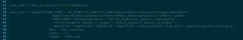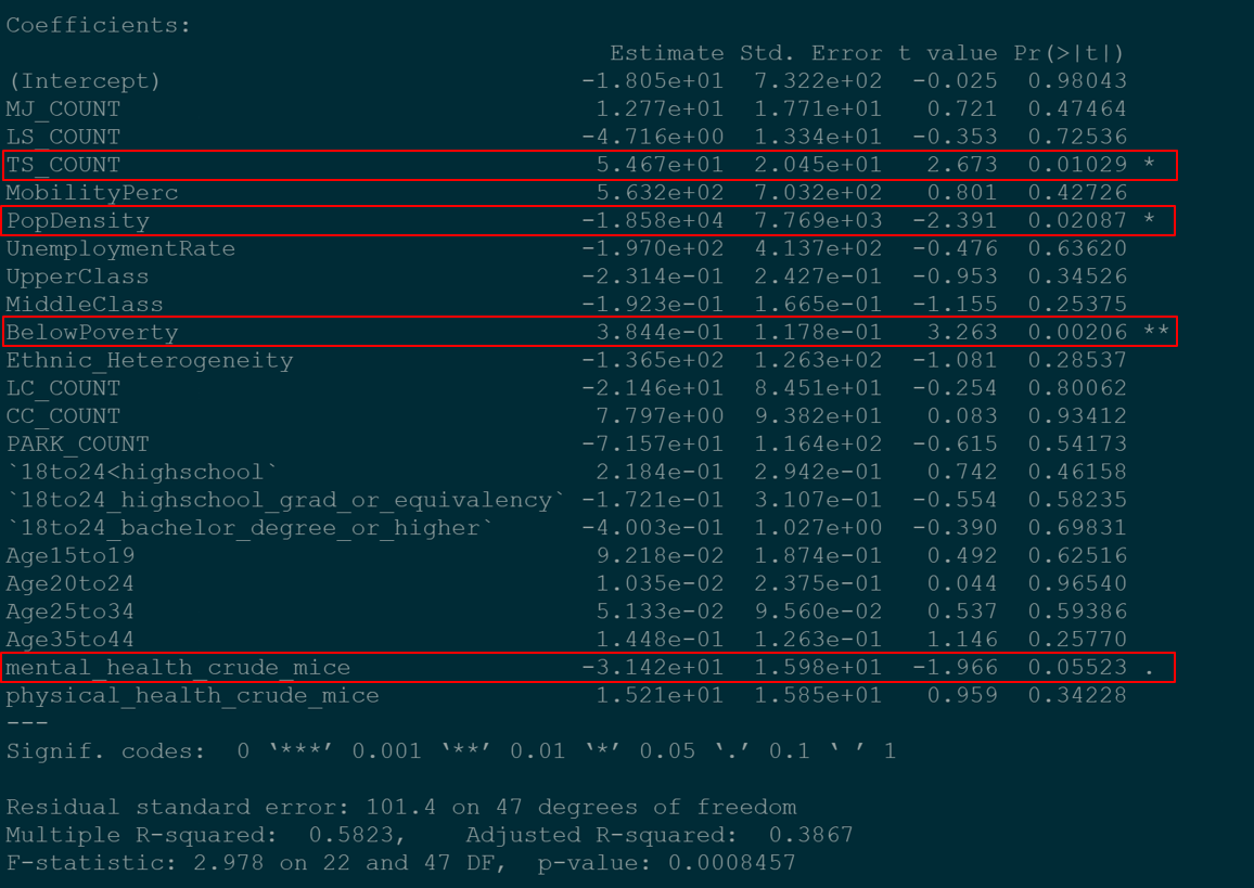 Given that crime count is continuous variable, we used an ordinary least squares regression model with nuisance property counts, community mobility, population density, unemployment rate, economic classes, racial heterogeneity, education levels, age, and physical and mental health as predictor variables. We also applied a training and test cross validation method to train our model on sixty percent of the census tracts and test on the remaining forty.