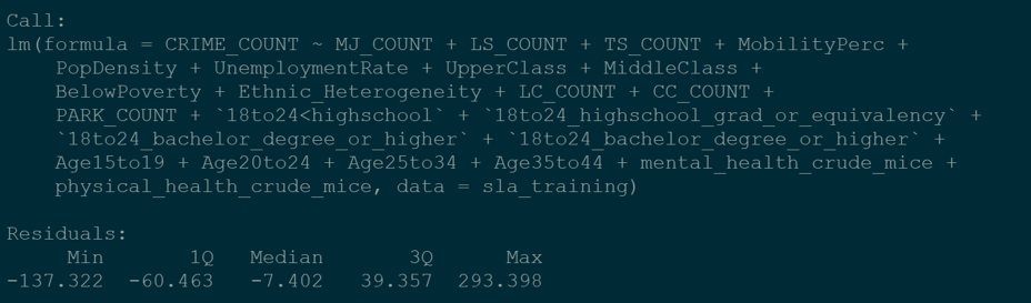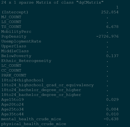 Doing so we calculated an R2 of .57 and an RMSE of 84.54 on the training set and an R2 of .39 and an RMSE of 82.79 on the test set. Variables displaying a p-value less than .05 included tobacco shops count, population density, below poverty count, and the imputed mental health estimate. We initially thought all variables would have a positive coefficient, however we were surprised to see that population density and the mental health estimates were negative. Population density we reasoned to have a negative impact on crime due to more people possibly dissuading criminal activity. The mental health estimate, we believe may have lost integrity after imputing missing values.