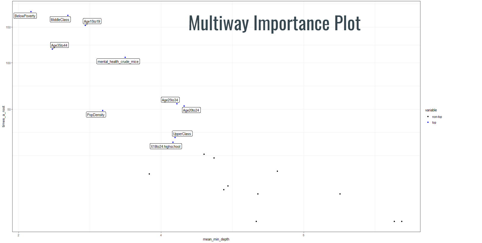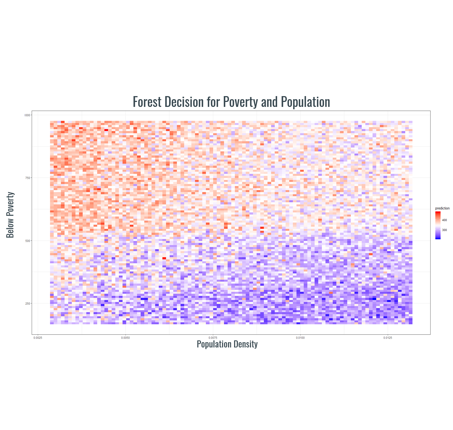 Harkening back to our initial exploration of the data, the random forest node depth output seemed to be in line with something previously noted. Two variables stood out here, being classified as below poverty (less than 30 thousand USD annual household income) and population density. This seemed to make sense as the lack of a steady income, coupled with a lack of people would make committing a crime that much more attractive. In doing a cross-chart of these two variables to see crime count estimations as a function of them individually and them together we were able to see an observable correlation between the presence of poverty and lack of people as being key indicators of crime. Likewise, where many people and those people are not in poverty we see less occurrences of criminal activity.