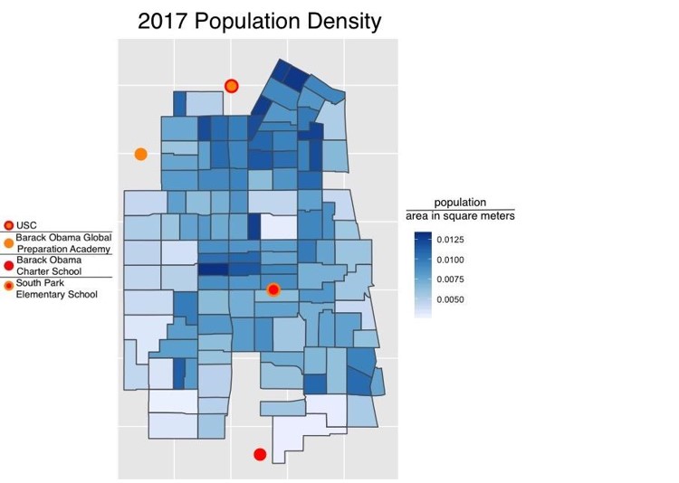 From mapped variables, the north side of South LA is the most population dense likely due to the vicinity of the University of Southern California.