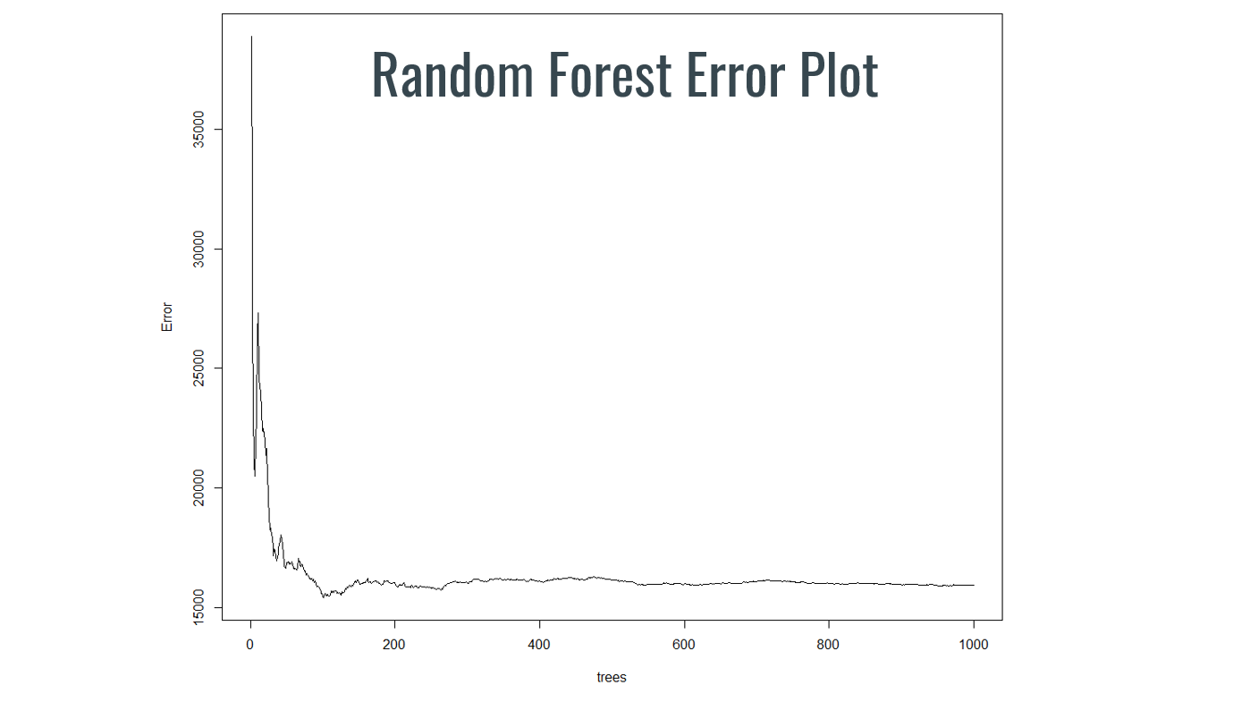 We then decided that although the results from the Elastic Net outperformed OLS, there may be an even further efficacy increase if we were to implement a random forest model. Essentially an amalgamation of many decision trees, we thought that the potential classification nature of crime estimation would lend itself well to this type of model. With there being so many potential factors in where crime is most prevalent having variables selected in order of importance and frequency through average node depth could paint a better picture on the key determinants of crime. Crime most certainly begets crime but there must be a myriad of other potential factors for such a complex social phenomenon. Our random forest model was set with 1000 trees as we found that beyond that the computational power needed did not justify the minimal error improvements. Past a few hundred trees is where most of the error reduction occurs.