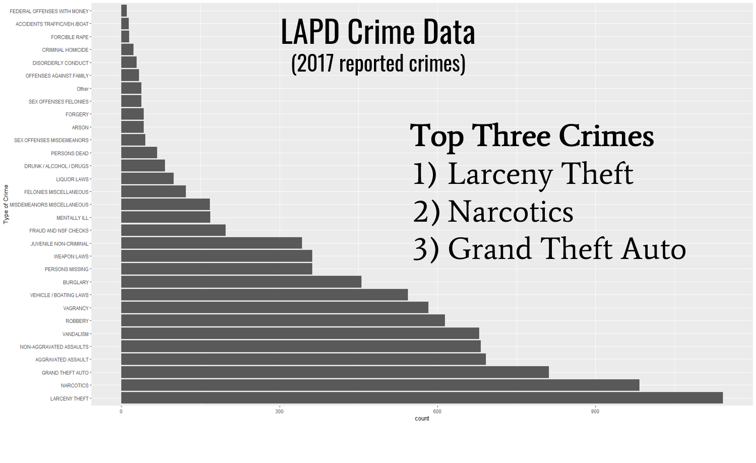 Of these crimes larceny, narcotics related crime, and grand theft auto were the top three crimes in 2017 after crime data was reduced to only violent and property crimes.